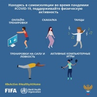 ФИФА, Организация Объединенных Наций (ООН) и Всемирная организация здравоохранения (ВОЗ) запустили кампанию #BeActive ("Быть активным"), призванную побудить людей быть #HealthyAtHome ("Здоровыми дома"), когда мир совместно и ежедневно борется с COVID-19.