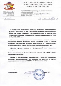 С ноября 2019 по февраль 2020 года Ростовская РОО «Федерация футбола» совместно с РОО «Ростовская любительская футбольная лига» дает старт Первенству Ростовской области по мини-футболу сезон 2019-2020 среди команд ДЮСШ по следующим возрастам 2006, 2007, 2008 и 2009 г.р.