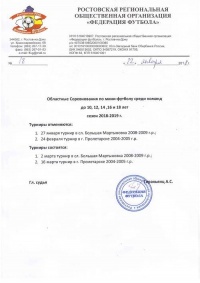 Обращаем Ваше внимание, на перенос турнир среди команд 2008/09 г.р. в сл. Большая Мартыновка с 27 января на 2 марта, и турнира среди команд 2004/05 г.р. в г. Пролетарск с 24 февраля на 16 марта.
