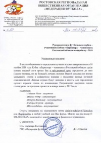 Просим Вас в трехдневный срок определить до пяти лучших игроков в Вашей команде по итогам минувшего сезона в алфавитном порядке с указанием амплуа. Ответы присылать на электронную почту dmitriy-sokolov-67@mail.ru или ffug@mail.ru.