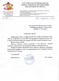 Информируем Вас, что финальный матч Кубка областной газеты «Молот» по футболу за сезон 2016 года состоится 15 апреля (сб) 2017 года в городе Ростове-на-Дону на стадионе «РГУПС» (искусственный газон).